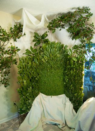 The true centerpiece of the night was the Yule Altar I created from seasonal evergreens: Holly (Ilex aquifolium), Magnolia (Magnolia grandiflora) and White Pine (Pinus strobus). The main element was a triptych-type of structure where I hand-applied individual Magnolia and Holly leaves. To frame the main piece I hung gorgeous fruiting branches of Holly. The altar really didn't come alive, however, until folks started sitting in the center of it and transformed into their Divine Selves.